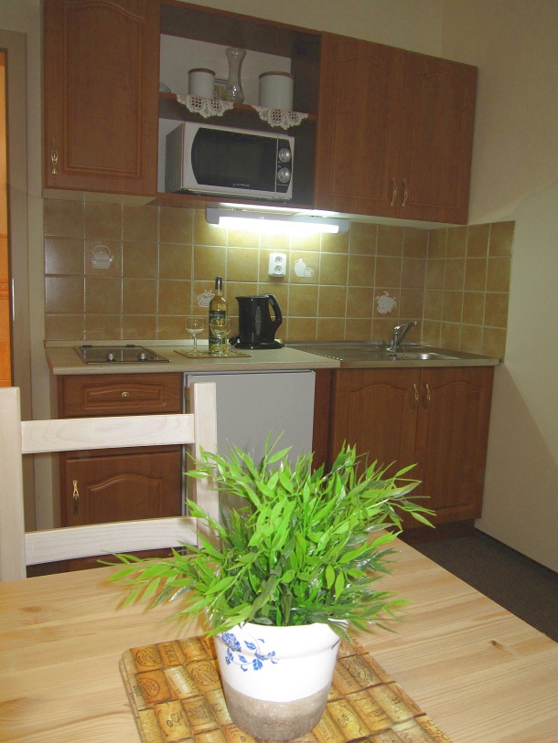 Каждый апартамент – двухкомнатный, с кухонным уголком, обеденной зоной, спальней, ЛСД-телевизором с кабельным вещанием, радио с СД-проигрывателем и радиобудильником. В большом апартаменте – двуспальная кровать и раскладывающийся диван, в малом апартаменте – две отдельные одноместные кровати. Кухня полностью оборудована посудой, имеется микроволновая печь, эл. керамическая плита, чайник, тостер, холодильник. В ванной комнате – душевая кабина, умывальник, WC. В большом апартаменте есть балкон, с видом на лес, журчащий ручей. К вашему расположению, в случае необходимости, детская кроватка, детский стульчик, и доб. кровать для взрослых.
